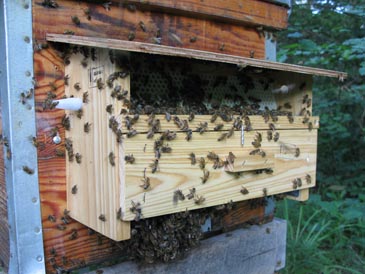 A pollen collector (also called pollen trap) is a covered porch over the hive entrance. It has a door with many holes for the bees to pass through, metal mesh floor, and a drawer to catch the pollen dropped by the bees.